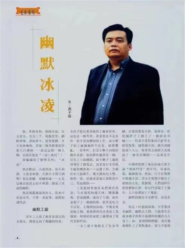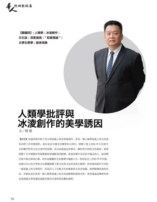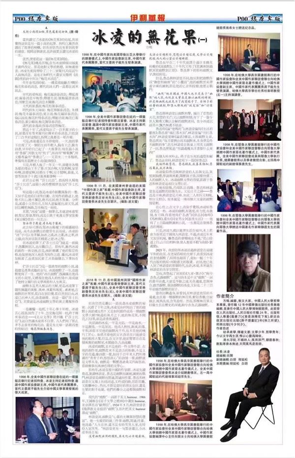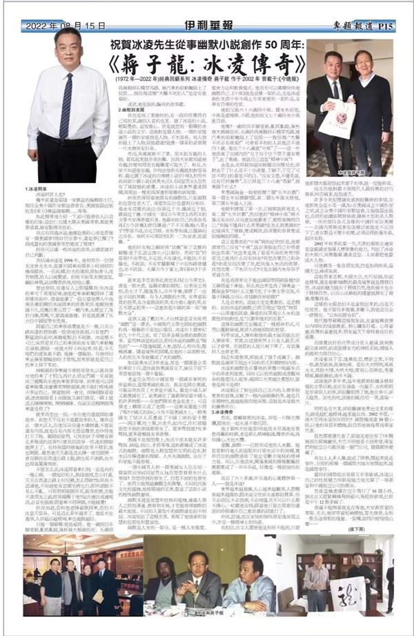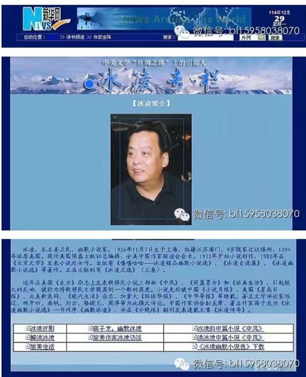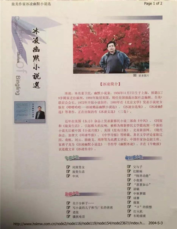 冰凌简介:本名姜卫民,旅美幽默小说家。祖籍江苏海门。1956年生于上海,1965年随家迁往福州。复旦大学新闻学院毕业。曾任《福建法制报》记者、编辑、《法制瞭望》杂志社编辑部主任、中国法学会会员、电子工业部神剑文学艺术学会常务理事,1982年加入福建省作家协会。1994年旅居美国。现任全美中国作家联谊会会长、纽约商务传媒集团董事长、纽约商务出版社社长兼总编辑、国际作家书局总编辑、《纽约商务》杂志社社长、《文化中华》杂志社社长、《国际美术》杂志社社长、《世界华文文学》丛刊社社长、《世界生态》杂志社社长、海外华文媒体协会名誉主席、杭州市侨商协会副会长、杭州冰凌文化传媒有限公司董事长、福州大学客座教授、浙江工商大学杭州商学院人文学院名誉院长、兼职教授、福建中医药大学客座教授、河北美术学院终身教授、浙江中华文化学院客座教授、阳光学院客座教授等。1972年开始小说创作,主要从事幽默小说创作与研究,发表小说、散文、剧作和新闻作品一千多万字,出版《嘻嘻哈哈——冰凌精品幽默小说》(1990年,海峡文艺出版社)、《冰凌自选集》(1998年,作家出版社)、《冰凌幽默小说选》(2002年,强磊出版社)、《冰凌幽默艺术论》(2006年,纽约商务出版社)、《幽默冰凌》(2012年,纽约商务出版社)、《蓝色梦幻》(2017年,四川文艺出版社、山东文艺出版社)、《冰凌文集》(2017年,纽约商务出版社)等著作。