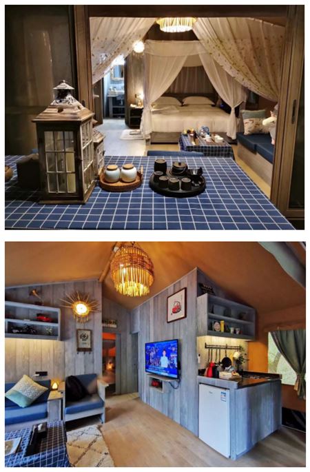 云林帐篷:在整个度假区内共有6栋,专为休闲度假和养生而打造,追求自然与原生态双结合。客房为两房一厅一阳台,房间分为大床房与儿童房。配套有空调、电视、地暖、温泉浴缸等设施;浴缸有双人模式并自带按摩功能,为您带来最舒适的体验。拉开窗帘,走出阳台,便可拥山色湖光入怀,深呼吸一口,负离子簇拥而来的体验仿佛就能让您忘却烦恼,重拾自己内心最真实的感受。