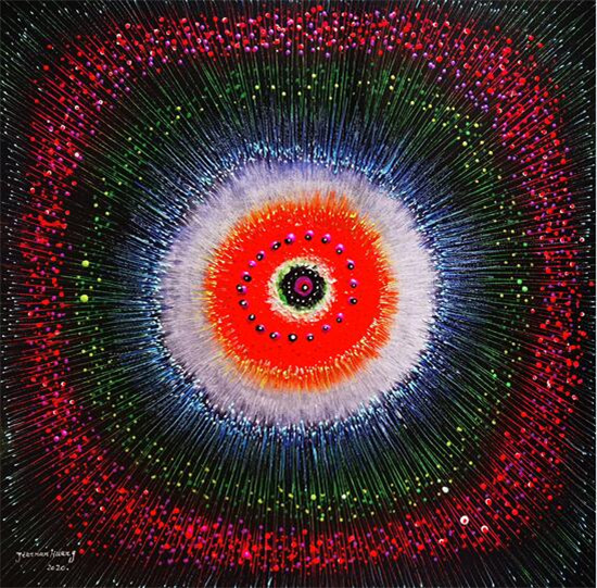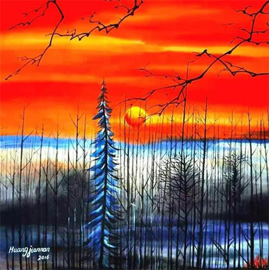 黄建南的油画和国画的画面色彩都鲜艳绚丽,想象力超凡,并呈现出了立体多元的空间画面感,不仅给予观赏者一种强大的震撼力,而且画面充满了神秘力量,给人的感受非常独特。