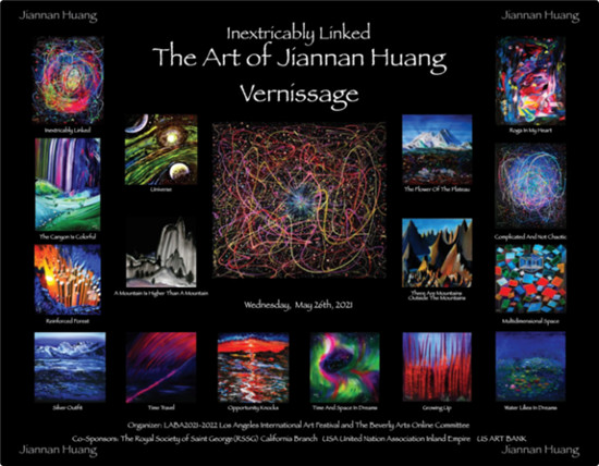 研讨会上,洛杉矶比佛利艺术节(LABA)和LABA洛杉矶国际艺术节当众宣布了一项独特的、名为“密不可分的联系——黄建南的艺术”艺术活动:黄建南的作品有限制性地在希尔顿酒店举行展出观赏。当天,共有黄建南的三幅油画被展出,分别是《千丝万缕》、《天外有天》和《地球密码》。