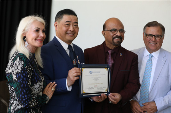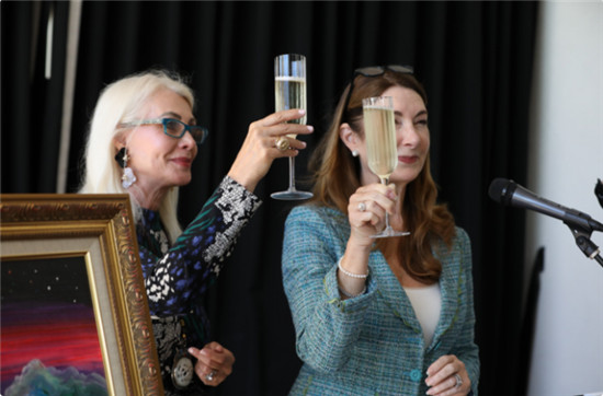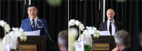 受疫情所限,黄建南未能亲自参加在比佛利山庄举行的活动。大会按照国际礼节,一众嘉宾在主持的带领下一起给予黄建南最高皇家礼仪——敬献祝酒词。而黄建南也在北京通过视频与现场的各界名流进行连线互动交流,并笑容满面地表达了感谢之情。这个跨国视频互动,把研讨会推上一个真正国际艺术文化交流平台。