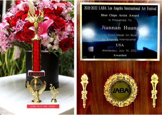 据悉,这次LABA 国际艺术节入围新闻发布会上,艺术节组委会在发布2021-2022 艺术节启动至今的成果和最新动向的同时,向著名艺术家黄建南颁发了“LABA国际艺术节蓝筹股艺术家”证书和奖杯。此外,联合国隶属机构——美国联合国协会(UNA- USA)给黄建南颁发了《世界优秀艺术家荣誉证书》。