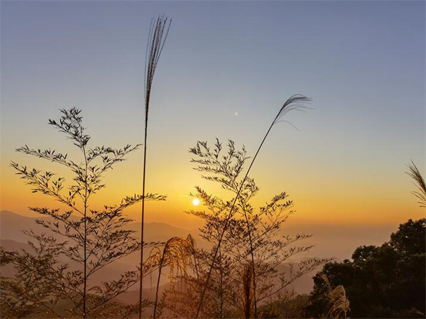 没看到日出,并不影响兴致。走走停停,来到大平山。左侧有山顶形似喇叭的喇叭山。前方还有九座山头构成的孤山,与旁边的凤凰山相辅簇拥,被当地人神化为龙凤呈祥景观。再往前,远远可以看到层层山峦尽头,有一高峰,这便是粤东第一高峰铜鼓峰。巨大的山体,成为瑞山天然的屏障。