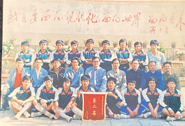 黄勇带队参加1987年福州地区高校足球邀请赛,荣获亚军载誉归来,与校党委书记陈政及相关领导及系负责人合影留念。