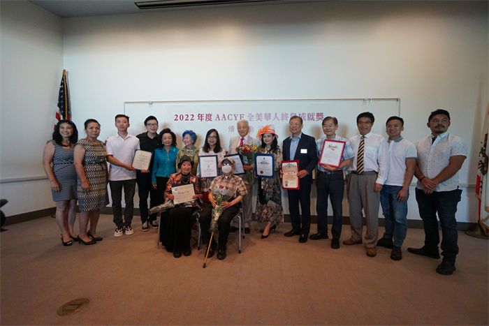 出席当天颁奖典礼的嘉宾合影蒙特利公园市(2022年9月1日)–南加州文化名人刘冰、华裔参政先锋黄赵企晨于9月1日下午在蒙特利公园市市立图书馆大厅内分别获颁“2022年度中华文化海外传承终身成就奖”;“2022年度公共事务及华人社区服务终身成就奖”,并接受了近百位南加州华裔社区知名人士的现场祝贺。主办机构同时宣布知名书法家、书法理论家亓汉友获颁“2022年度中国文化艺术杰出成就奖”。圣盖博市华裔市长丁言愉、嘉伟学区教育委员任子安(Andy Yam)出席了当天的颁奖典礼并致辞向获奖者表示祝贺。