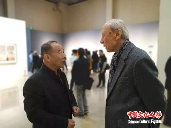 韩玉臣向中国国家画院油画院院长詹建俊介绍佛罗伦萨双年展盛况