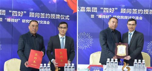 陆加壹集团董事长助理、“睡得好”负责人张锋发与左和鸣秘书长(左)签约并向其授牌。