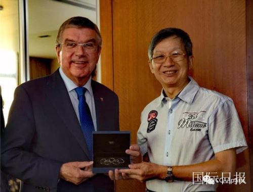 ▲2019年9月16日,国际奥委会主席巴赫在北京会见黄建南,并接受了黄建南专门为2022年冬奥会创作的油画作品《奥运之花》。
