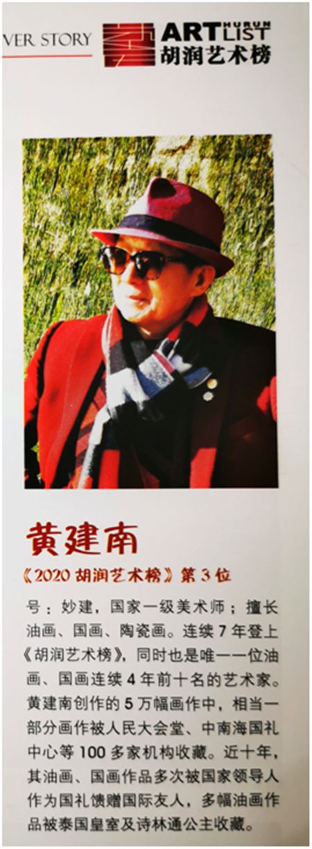 黄建南,号“妙建”,国家一级美术师,擅长油画、国画,是全球公益联盟金质勋章获得者,荣获印度尼西亚皇室“伯爵”爵位。自2015年以来,连续在胡润艺术排行榜排名前十名,并在2019年胡润艺术排行榜取得第四的成绩,是目前唯一一个在油画和国画同时排名前十的画家,在欧美艺术权威网站artprice的全球当代艺术家500强中排名第21位。