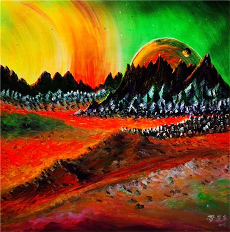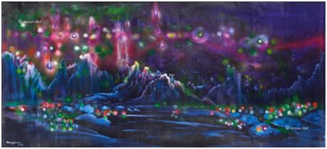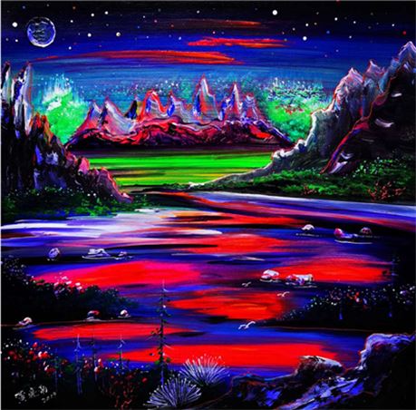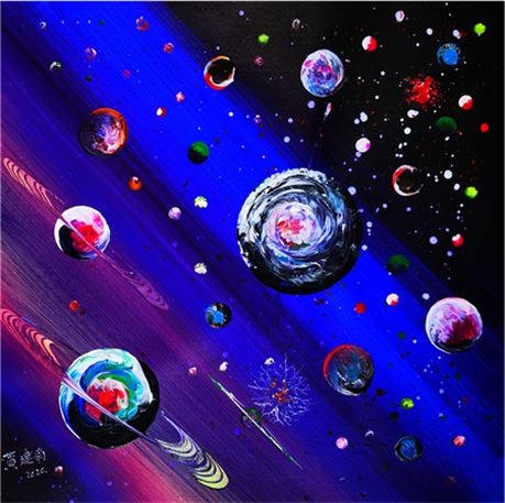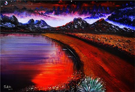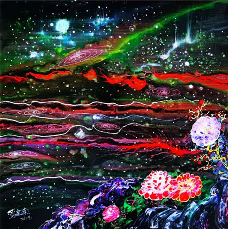 《璀璨星空》长度近3米,是黄建南宇宙星际题材的代表作和集大成的作品。如科学家幻想宇宙地球及自然的未来,黄建南将浩渺无垠的的天际,无比绚丽璀璨的星空用瑰丽雄奇的想象呈现出来。各种大胆的表现手法,把宇宙星空的动与静、色与光提炼成精华,相映成趣,相得益彰,也就构成黄建南作品的独特佳境。