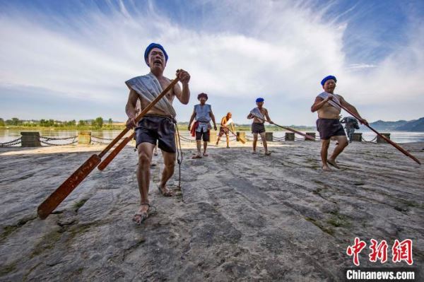 嘉陵江边,几名曾今的老纤夫在演示拉纤情景。 杜培兵 摄
