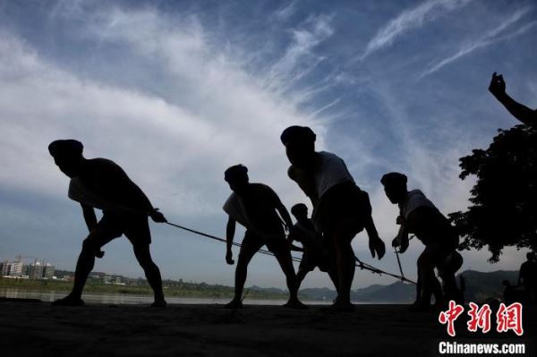 嘉陵江边,几名曾经的老纤夫在演示拉纤情景。 李锋 摄