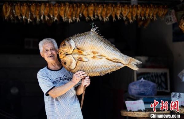 周子古镇上的一位老人向游客展示自己晾晒的鱼干。 董宁 摄