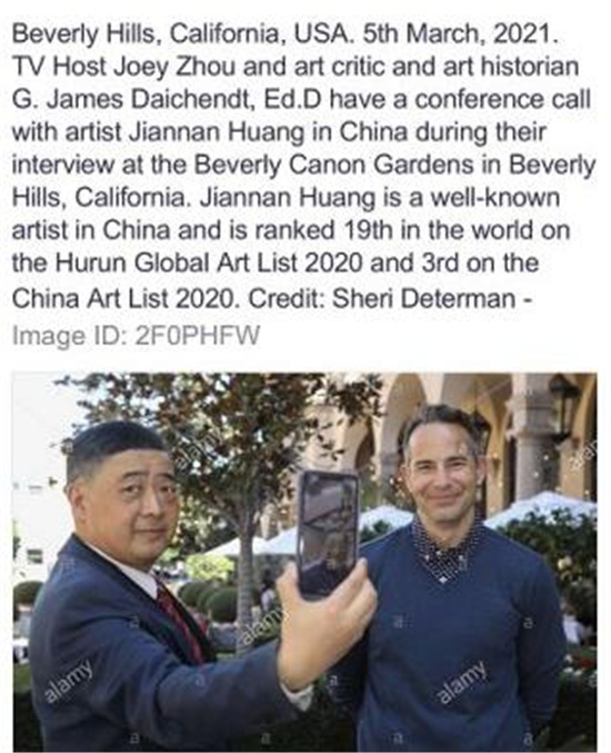 日前,世界著名艺术评论家、艺术历史学家G·詹姆斯·戴钦特(G. James Daichendt)在美国加利福尼亚州比佛利山庄的贝弗利佳能花园,接受了电视节目主持人周正(Joey Zhou)的采访。其间,戴钦特与中国艺术家黄建南进行了视频连线(如上凤凰卫视截图),探讨有关艺术的话题。