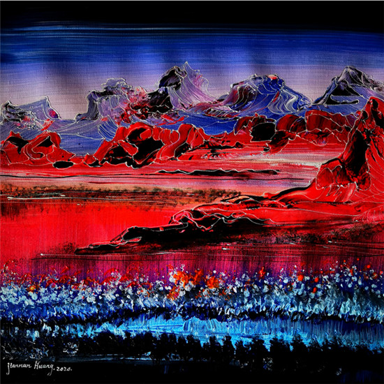《光辉历程》(下图)用浓烈的色彩构画了梦幻般的童话世界。火一样的远山近岭,预示着全世界人民的热情。次第热烈盛开的奥运之花,象征着体育健儿永攀高峰的伟大精神。“艺术与奥运融合,用中国艺术支持中国冬奥,传播奥运精神,弘扬中国文化,为奥运喝彩。我以火热的情怀、热烈的笔触、丰富的色彩美学倾情创作,以响应现代奥运之父顾拜旦所倡导为人类而运动之关爱人类福祉,共创世界和平的理想实践。”黄建南表示。
