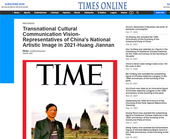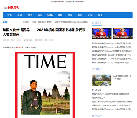 这一期的《时代周刊》发行了中英文双语版,以《跨国文化传播视界——2021年度中国国家艺术形象代表人物黄建南》为题,大篇幅报道黄建南。该专题不仅介绍了黄建南的成长历程、艺术之路,还展示了黄建南的20多幅作品。