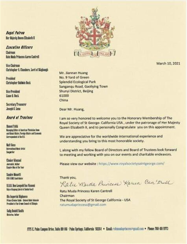 ▲凯伦·坎特雷尔公主在给黄建南的贺信中说:非常荣幸地欢迎您在女王陛下的支持下成为荣誉会员