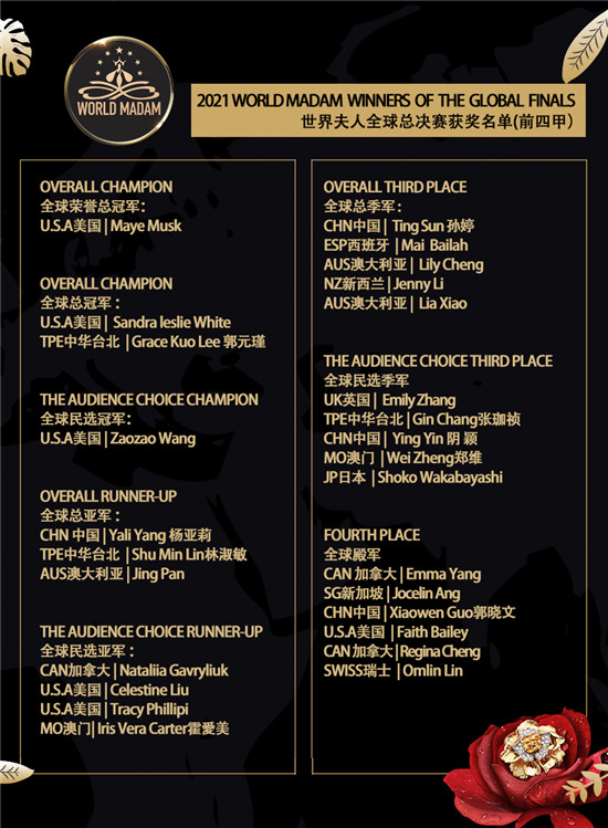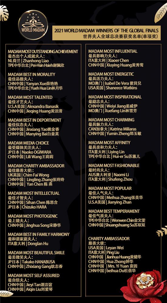 WORLD MADAM世界夫人2021全球总决赛获奖名单: