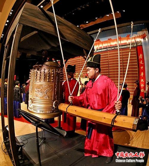 庄严肃穆的中华祭祖仪式在钟鼓和鸣中正式开始,千年古钟敲响,祈福世界和平、国家安泰、人民幸福