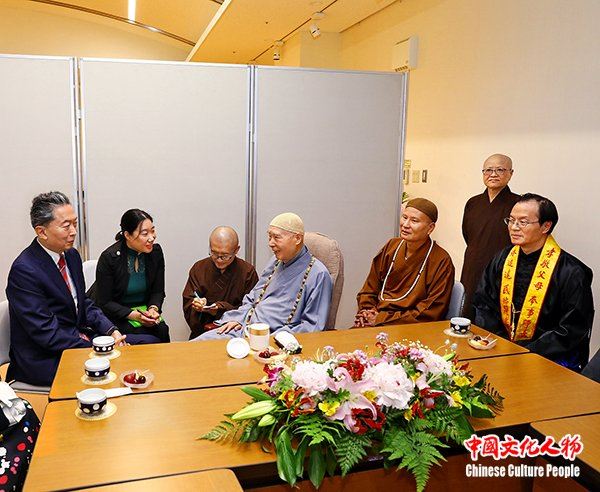 祭祖大典之前,净空老法师与日本前首相鸠山由纪夫,东京华助中心主任、全日本华侨华人联合会名誉会长颜安等嘉宾们在会客室谈话交流