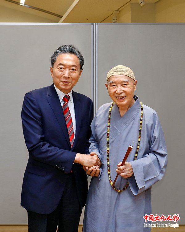 净空老法师与东京华助中心主任、全日本华侨华人联合会名誉会长颜安在祭典现场亲切交流,祝贺中华祭祖大典成功举办