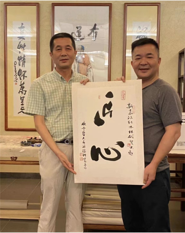 ▲全国政协委员、广东省客家商会会长、深圳大百汇集团董事长温纯青(右)挥毫“匠心”,并亲手赠予林雄星。