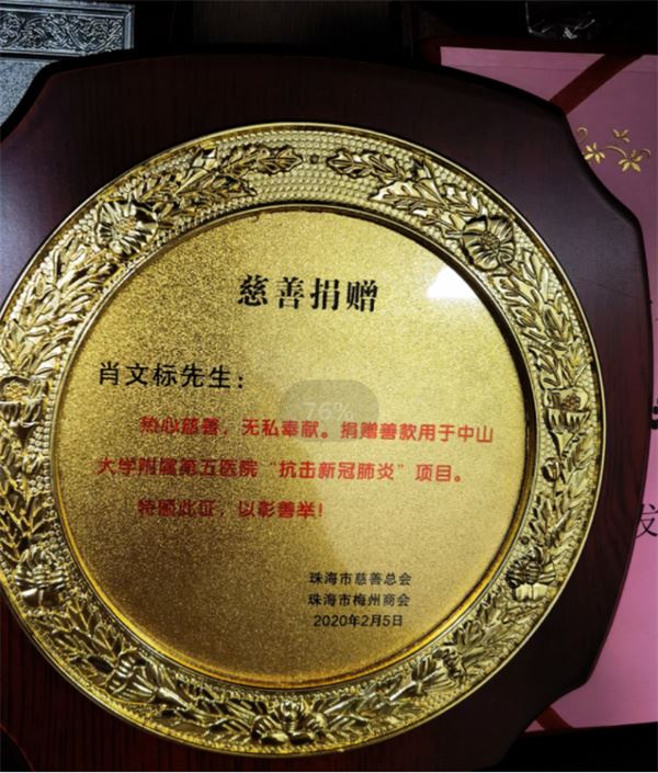 ▲珠海市慈善总会、珠海市梅州商会授予肖文标的奖牌