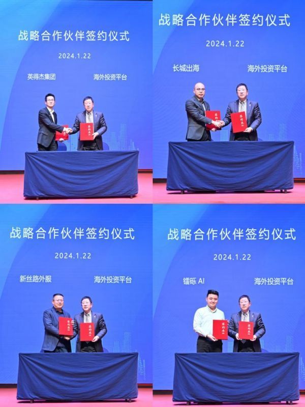 会上,海外投资平台分别与英得杰集团、新丝路外服、镭砾AI和长城出海签订战略协议共同助推企业出海。
