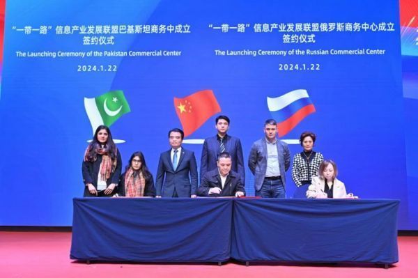 会上,“一带一路”信息产业发展联盟副秘书长郑传军,俄罗斯UGL集团人力资源总监Anna Belova女士和巴基斯坦Lasiro科技公司代表Ayesha Khan女士上台签约,成立了俄罗斯商务中心和巴基斯坦商务中心,巴基斯坦和俄罗斯企业家代表以及与会嘉宾们共同见证了国别商务中心的成立。