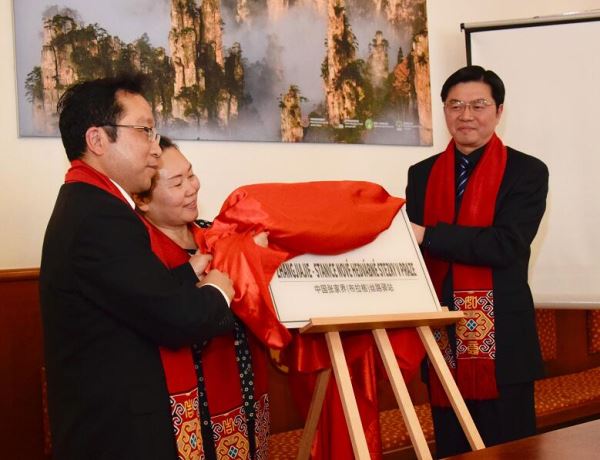 湖南省贸促会副会长傅丹舟(右)、张家界市政协副主席李文化(左)、捷克中欧通讯社王跃秋社长(中)为中国张家界(布拉格)丝路驿站揭牌