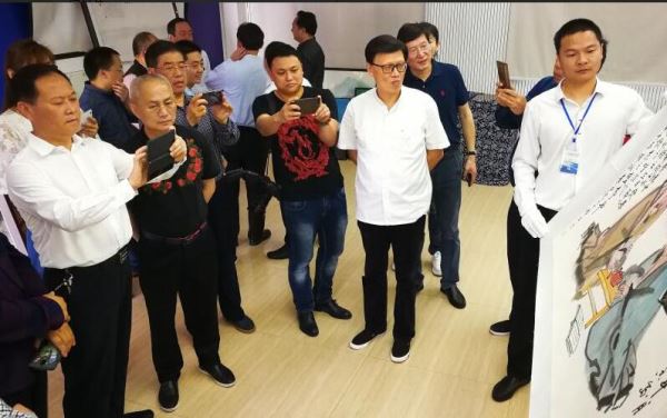 湖南省人大常委会副主任、湘西自治州委书记叶红专(左一)在总策划叶文智陪同下,观看并手机拍照拍卖作品