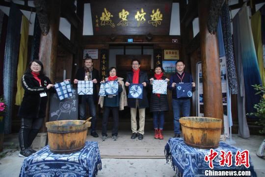 在阆中染坊客栈,来自韩国的林秀美在技师的指导下将白色棉布用五条皮筋扎成圆柱状的布团。随后,林秀美将布团放在用板蓝根提取的深蓝色染料中浸泡,并轻轻搓揉。布团在她手中由淡转浓。打开后,一张染有同心圆图案的棉布成功出炉。
