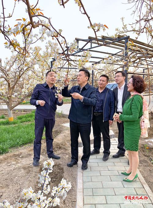 4月10日,新疆巴州人民政府副州长冯雪海与巴州阿瓦提农场党委书记唐平在阿瓦提农场香梨园指导生态文明建设