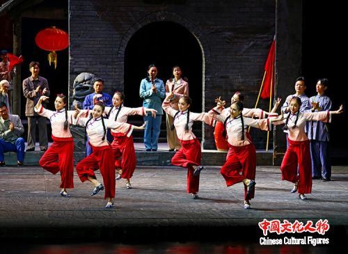 在民歌《拔根芦柴花》活泼明快的旋律中,人们跳起舞蹈迎接新生活的到来