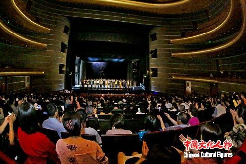 剧终,著名男高音歌唱家王宏伟、青年女高音龚爽、男中音歌唱家张海庆等主要演员向观众致谢