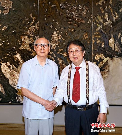5月29日,中国美术家协会顾问、中国国家画院油画院院长、中国油画学会名誉主席詹建俊来到中国美术馆,在著名油画家蔡居的陪同下,参观“雕琢复朴——蔡居抽象画展”