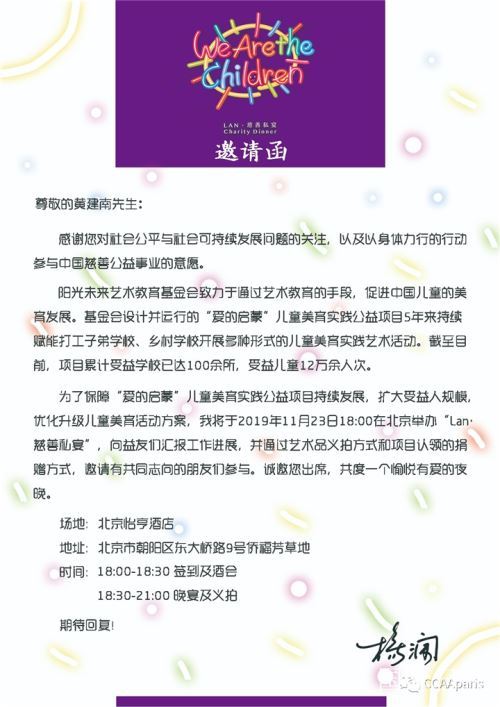 主办方表示,此次活动是为了保障“爱的启蒙”儿童美育实践公益项目持续运营与发展,扩大受益人规模,优化升级儿童美育活动方案。通过举办“2019LAN•慈善私宴”,邀请有共同志向的朋友们参与,以艺术品义拍方式和项目认领的捐赠方式,借助艺术之力让爱滋养下一代的心灵。