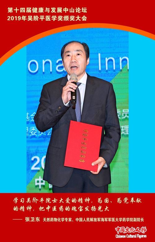 天然药物化学专家、中国人民解放军海军军医大学药学院副院长张卫东发表获奖感言,他表示要学习吴阶平院士大爱的精神,为国、为党奉献的精神,把中医药的瑰宝发扬光大