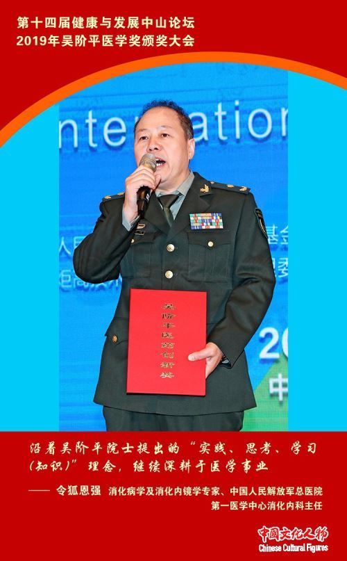 消化病学及消化内镜学专家、中国人民解放军总医院第一医学中心消化内科主任令狐恩强发表获奖感言,他表示将沿着吴阶平院士提出的“实践、思考、学习(知识)”理念,继续深耕于医学事业