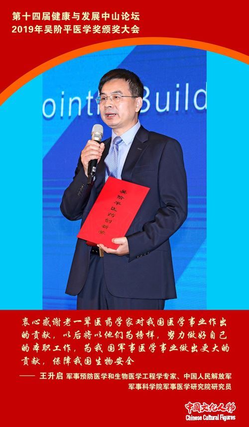 军事预防医学和生物医学工程学专家、中国人民解放军军事科学院军事医学研究院研究员王升启发表获奖感言,衷心感谢老一辈医药学家对我国医学事业作出的贡献,以后将以他们为榜样,努力做好自己的本职工作,为我国军事医学事业做出更大的贡献,保障我国生物安全