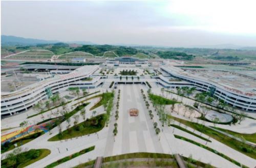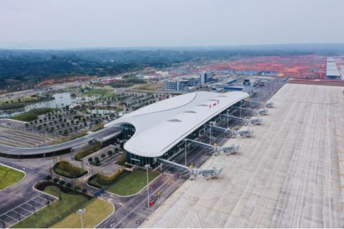 五粮液机场站前广场彰显山水宜宾的韵味。(宜宾新闻网 潘一豪摄)