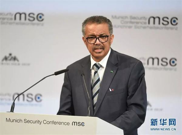 2月15日,在德国慕尼黑,世界卫生组织总干事谭德塞在第56届慕尼黑安全会议上讲话。 新华社记者 逯阳 摄