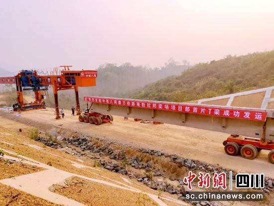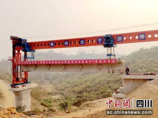 中新网四川新闻3月24日电 (陈军德 张浪)记者24日从成都市青白江区获悉,老挝时间3月23日6点30分,随着中老铁路琅勃拉邦境内首座桥梁铺设所需T梁成功装载到运梁车上,缓缓运往现场铺架,标志着中铁八局施工标段正式进入铺架阶段,中老铁路工程全线建设顺利推进。