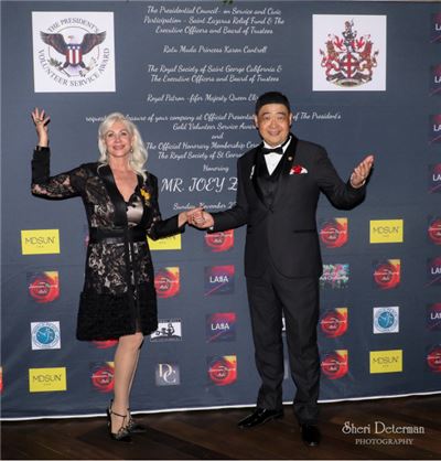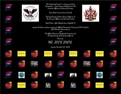 此外,就连在比佛利举办的“美国总统志愿服 务奖”的背景墙,都选用黄建南的三幅油画为标识,数量多达32个,占了总标识44个的三分之二还多(如上图)。