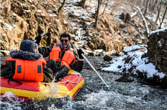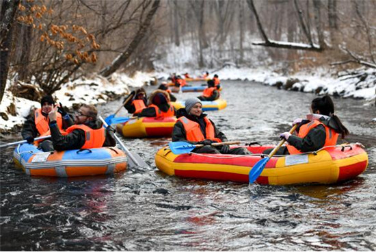 长白山麓的露水河国家森林公园,群山环绕、树木掩映,外籍友人们三两结对,置身林间小溪中,一同体验了冬季漂流。