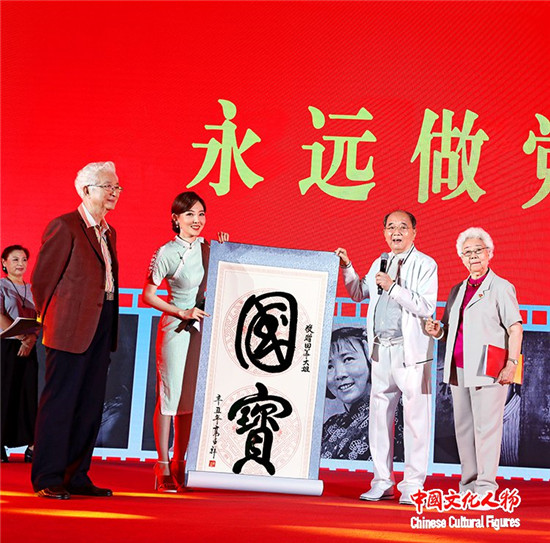 文化部原常务副部长高占祥向著名表演艺术家田华赠送自己的书法作品《国宝》表达自己的敬意